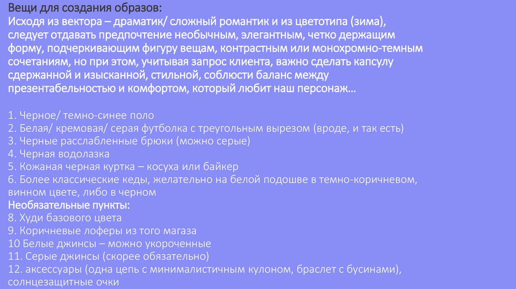 Вещи для создания образов:Исходя из вектора – драматик/ сложный романтик и из цветотипа (зима),