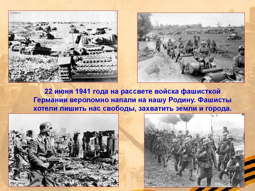 22 июня 1941 года на рассвете войска фашисткойГермании вероломно напали на нашу Родину. Фашисты