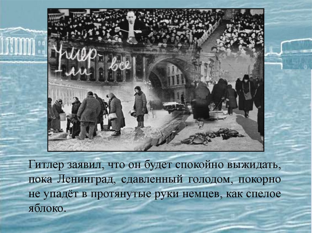 Гитлер заявил, что он будет спокойно выжидать,пока Ленинград, сдавленный голодом, покорно