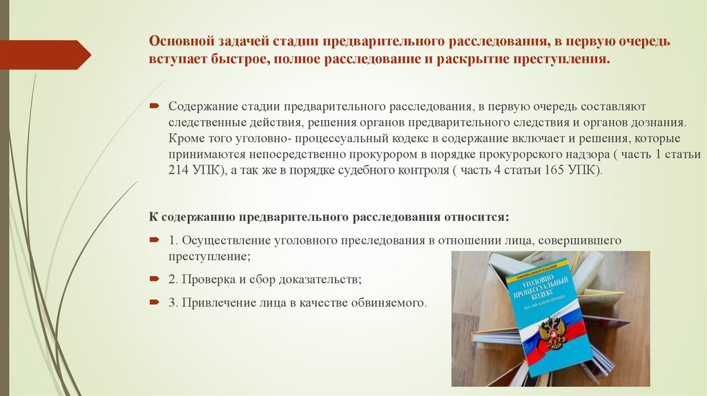 Основной задачей стадии предварительного расследования, в первую очередьвступает быстрое, полное расследование и раскрытие преступления.