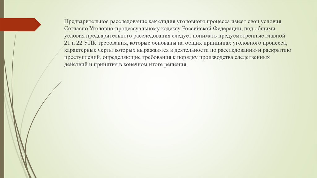 Предварительное расследование как стадия уголовного процесса имеет свои условия.Согласно Уголовно-процессуальному кодексу Российской Федерации, под общими