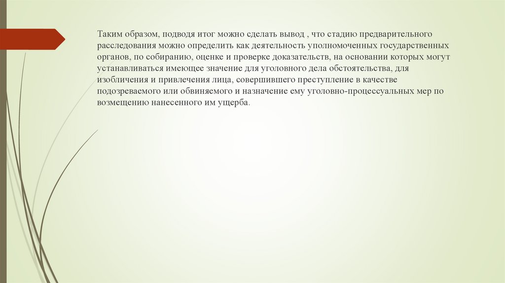 Таким образом, подводя итог можно сделать вывод , что стадию предварительногорасследования можно определить как деятельность уполномоченных государственных