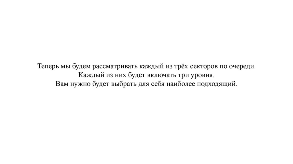 Теперь мы будем рассматривать каждый из трёх секторов по очереди.Каждый из них будет включать три уровня.