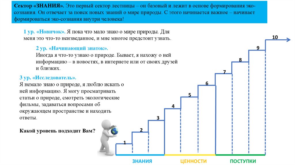 Сектор «ЗНАНИЯ». Это первый сектор лестницы – он базовый и лежит в основе формирования экосознания. Он отвечает за поиск новых знаний о мире природы. С этого начинается важное – начинаетформироваться эко-сознания внутри человека!