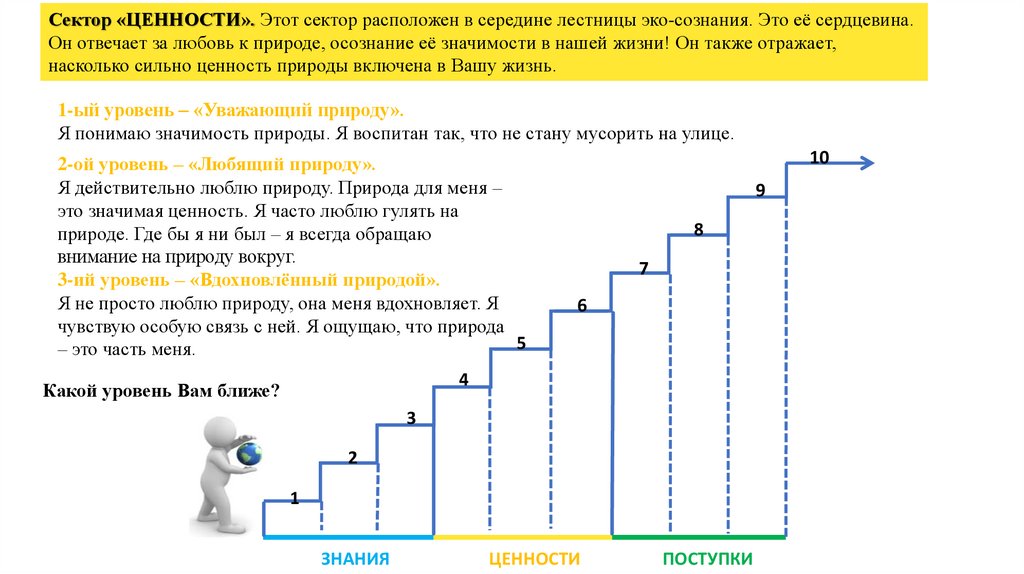 Сектор «ЦЕННОСТИ». Этот сектор расположен в середине лестницы эко-сознания. Это её сердцевина.Он отвечает за любовь к природе, осознание её значимости в нашей жизни! Он также отражает,