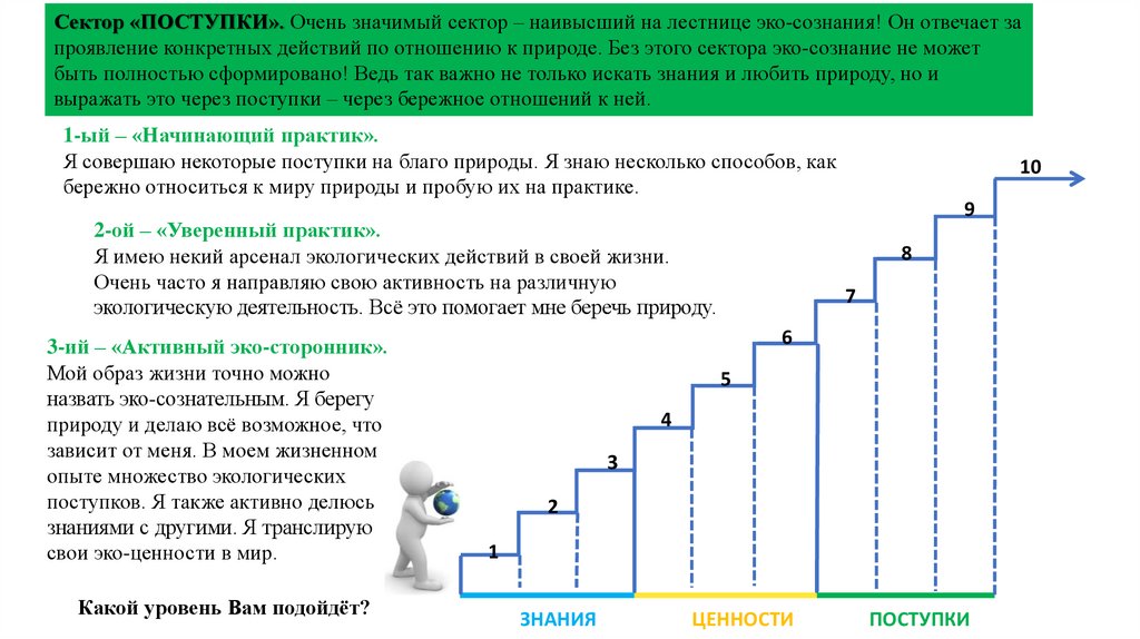 Сектор «ПОСТУПКИ». Очень значимый сектор – наивысший на лестнице эко-сознания! Он отвечает запроявление конкретных действий по отношению к природе. Без этого сектора эко-сознание не может