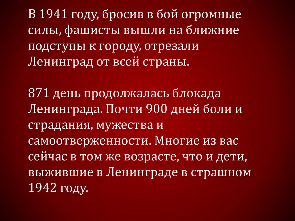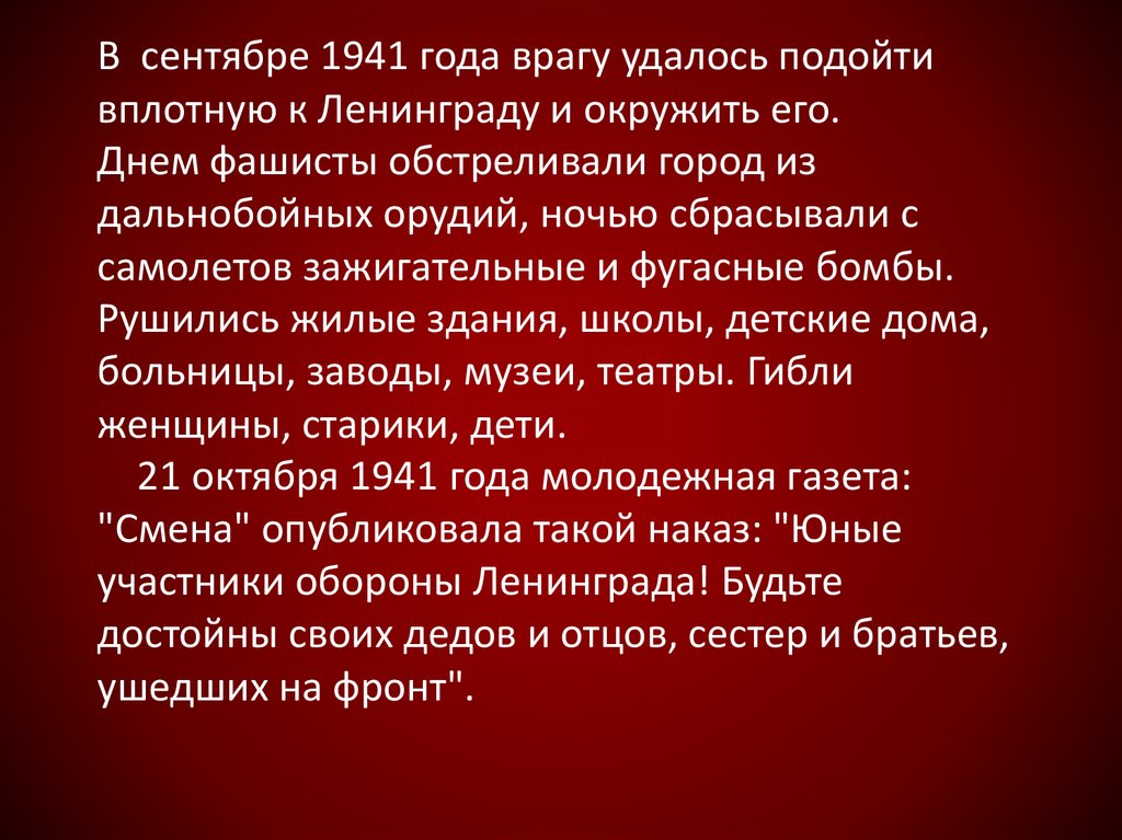 В сентябре 1941 года врагу удалось подойтивплотную к Ленинграду и окружить его.