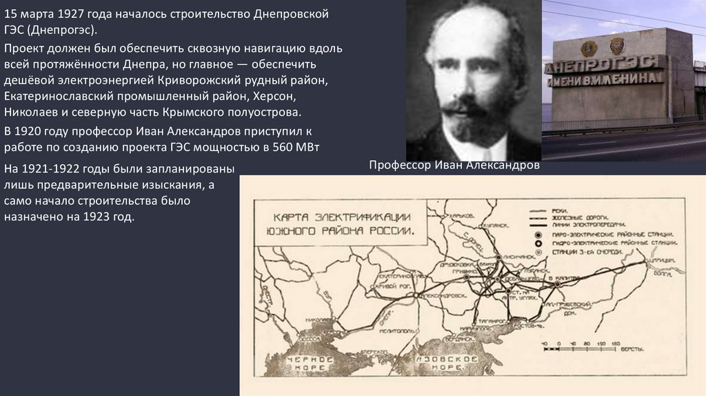 15 марта 1927 года началось строительство ДнепровскойГЭС (Днепрогэс).