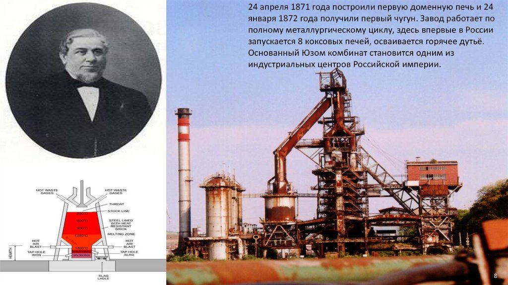 24 апреля 1871 года построили первую доменную печь и 24января 1872 года получили первый чугун. Завод работает по