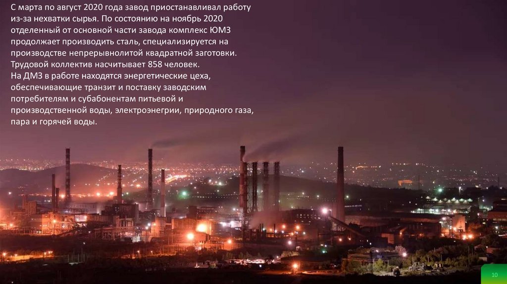 С марта по август 2020 года завод приостанавливал работуиз-за нехватки сырья. По состоянию на ноябрь 2020