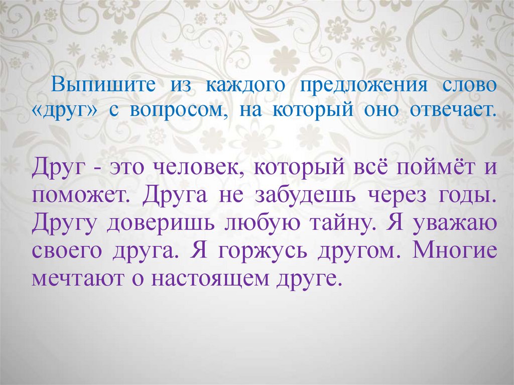 Выпишите из каждого предложения слово«друг» с вопросом, на который оно отвечает.
