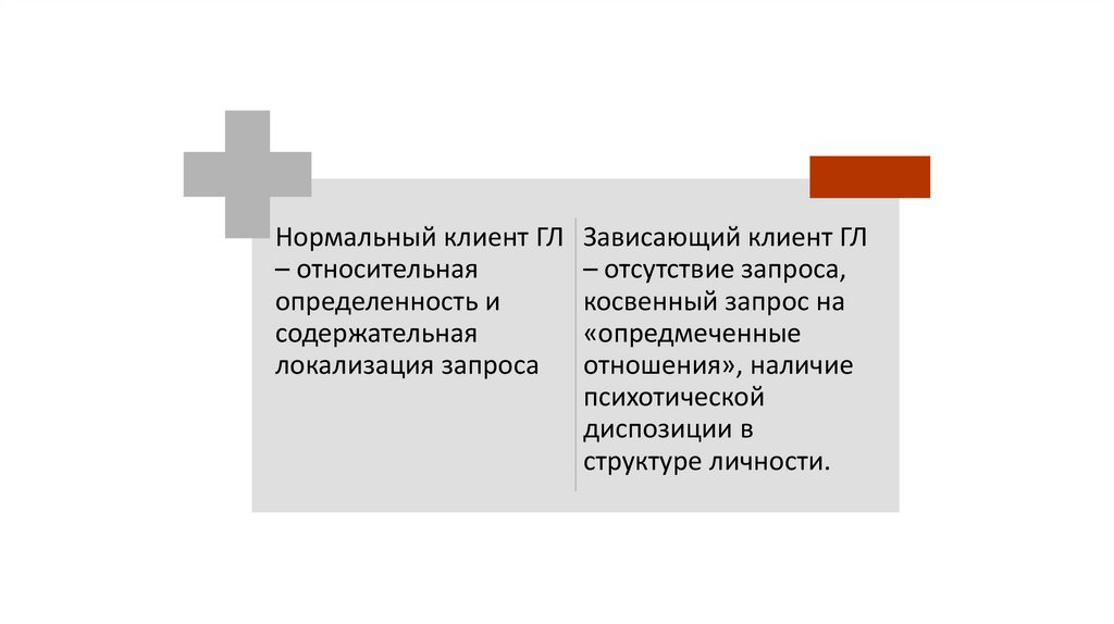 • Клиент ГЛ: низкая степень когнитивной представленности