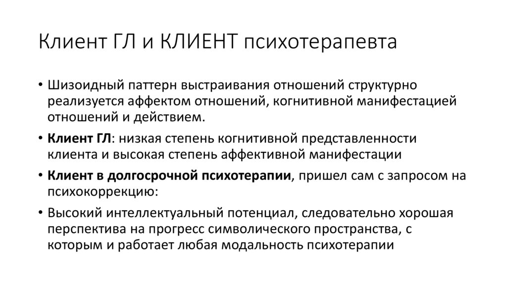 Клиент ГЛ и КЛИЕНТ психотерапевта• Шизоидный паттерн выстраивания отношений структурно