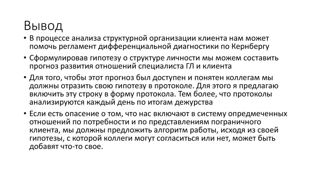 • Проверка диагностической гипотезы специалиста по Кернбергу в