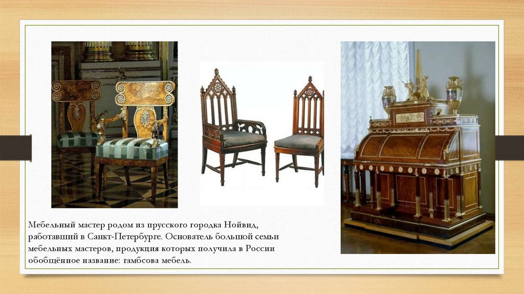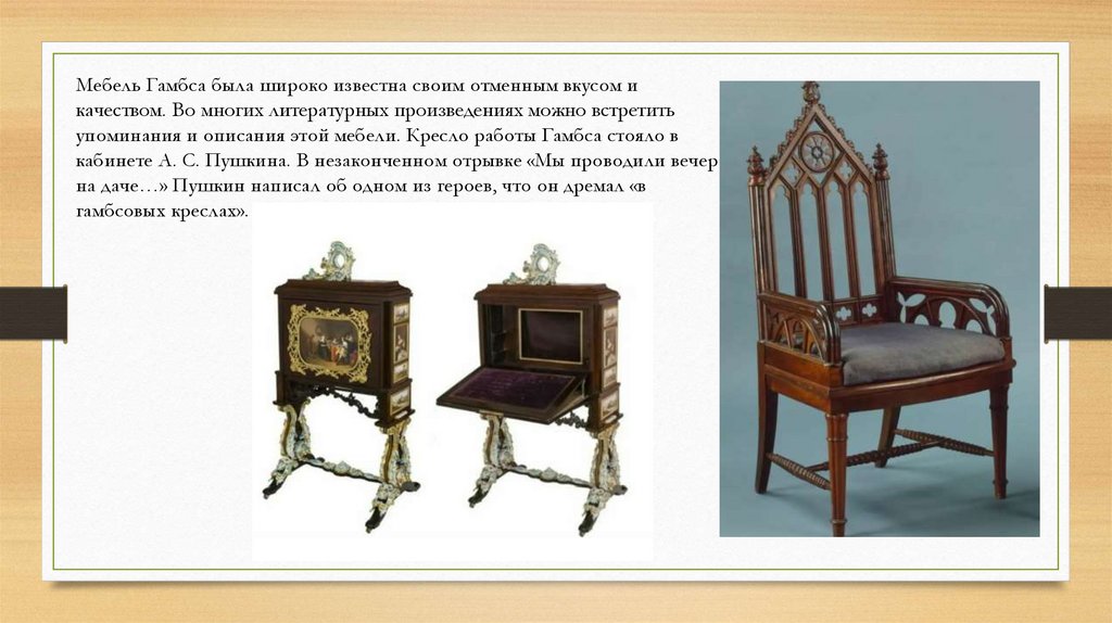 Мебель Гамбса была широко известна своим отменным вкусом икачеством. Во многих литературных произведениях можно встретить
