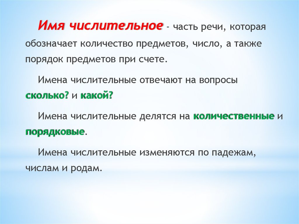 Имя числительное - часть речи, котораяобозначает количество предметов, число, а также