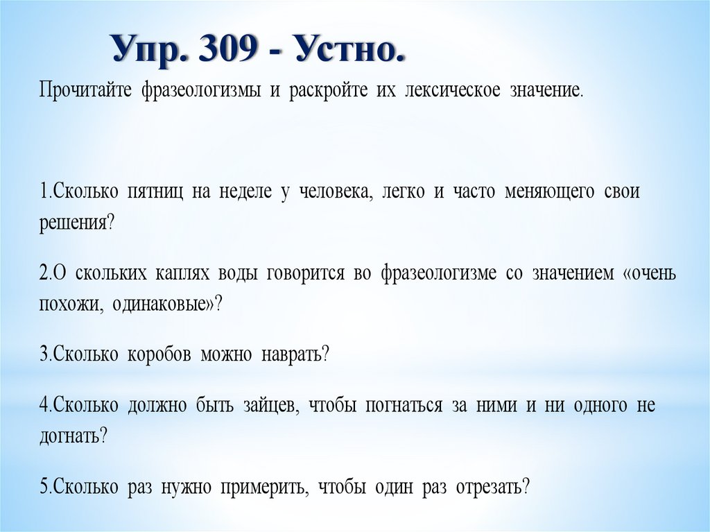 Упр. 309 - Устно.Прочитайте фразеологизмы и раскройте их лексическое значение.