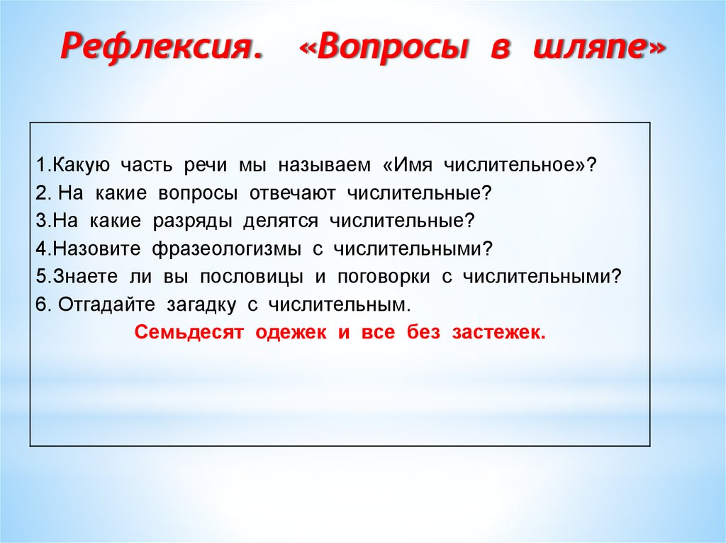 Рефлексия. «Вопросы в шляпе»1.Какую часть речи мы называем «Имя числительное»?
