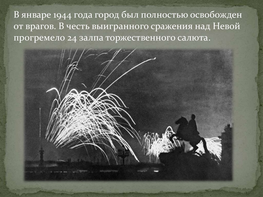 В январе 1944 года город был полностью освобожденот врагов. В честь выигранного сражения над Невой