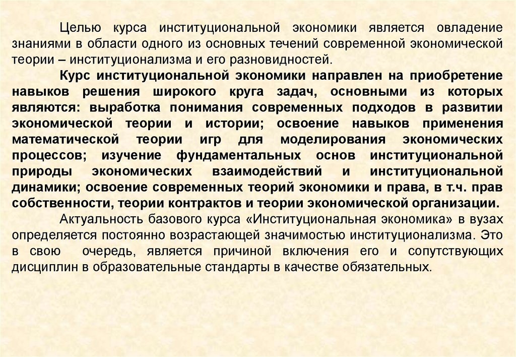 Целью курса институциональной экономики является овладениезнаниями в области одного из основных течений современной экономической