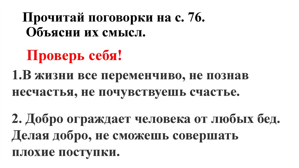 Прочитай поговорки на с. 76.Объясни их смысл.