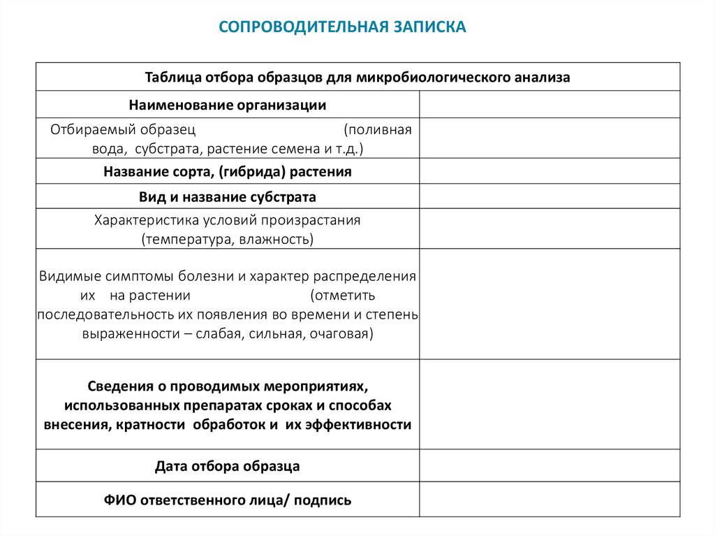 СОПРОВОДИТЕЛЬНАЯ ЗАПИСКАТаблица отбора образцов для микробиологического анализа