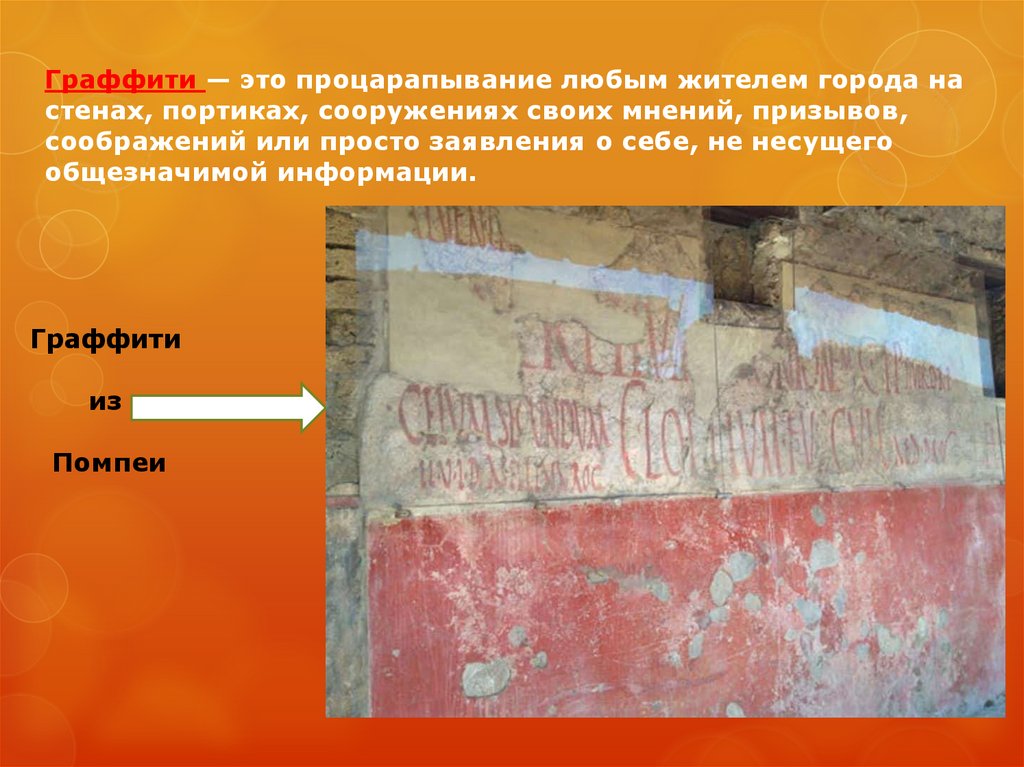 Граффити — это процарапывание любым жителем города настенах, портиках, сооружениях своих мнений, призывов,