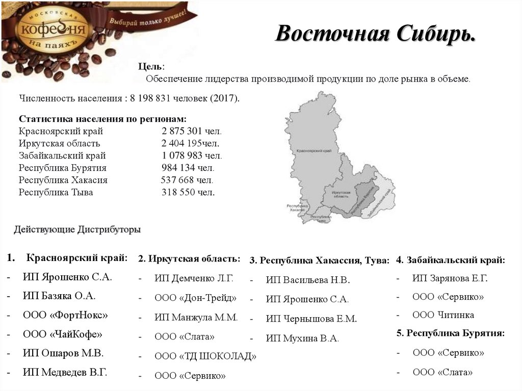 Красноярский край: 2. Иркутская область: 3. Республика Хакассия, Тува: 4. Забайкальский край: