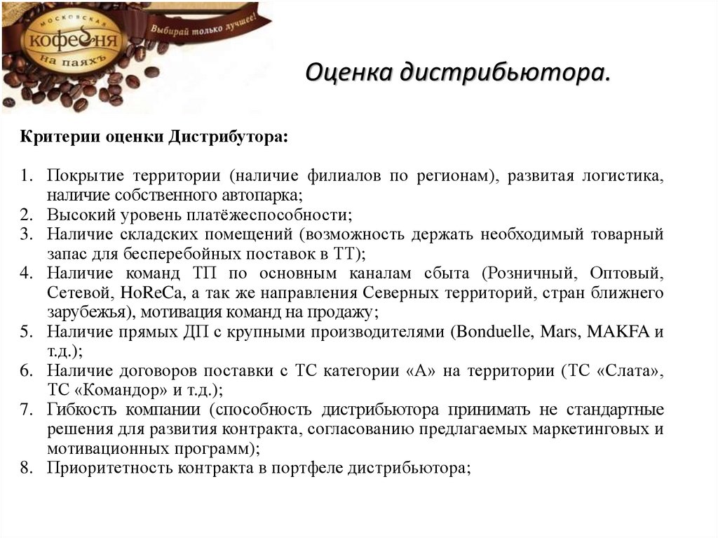 Оценка дистрибьютора.Критерии оценки Дистрибутора: