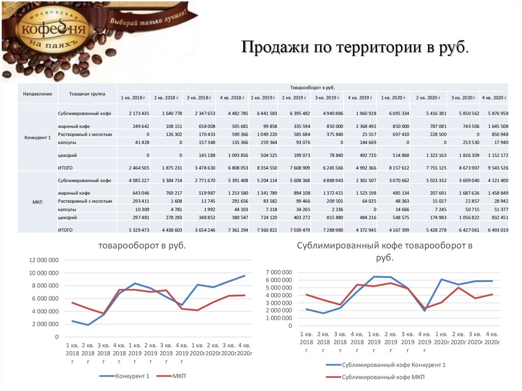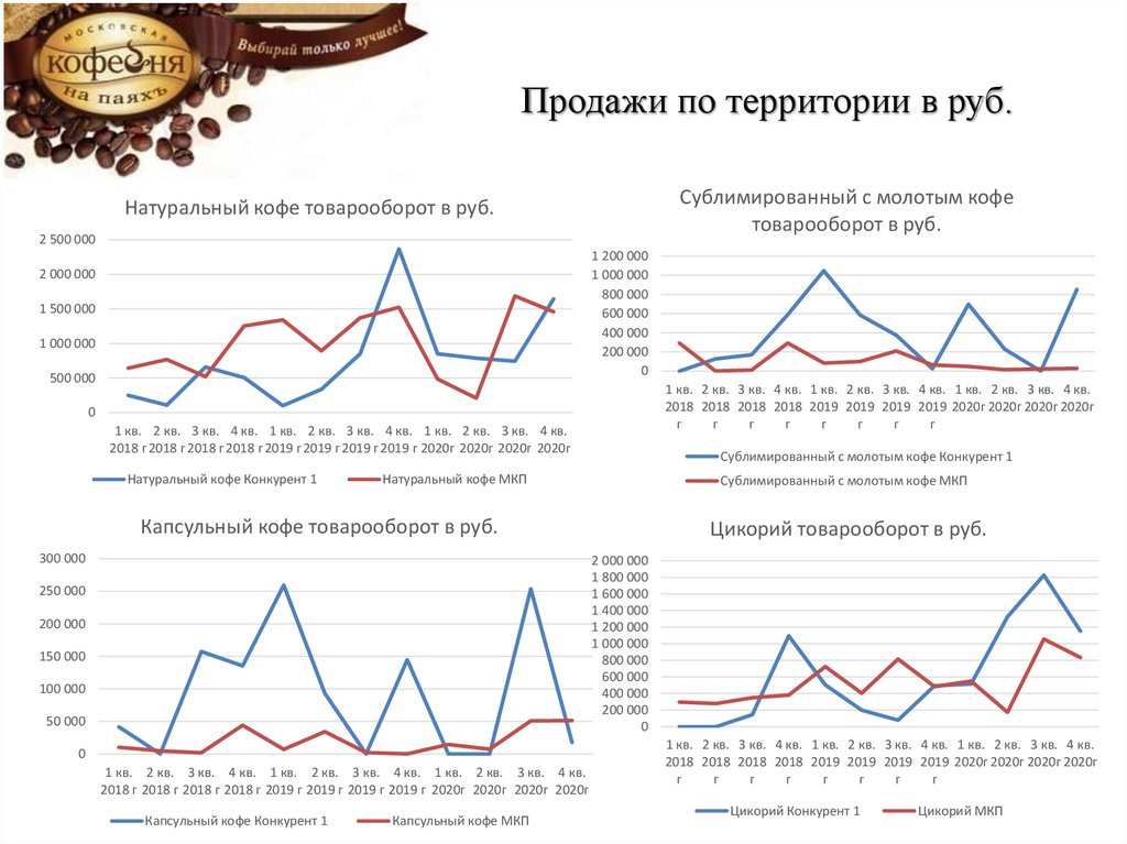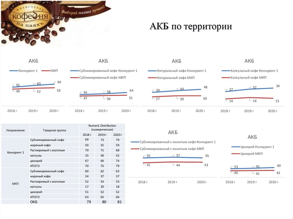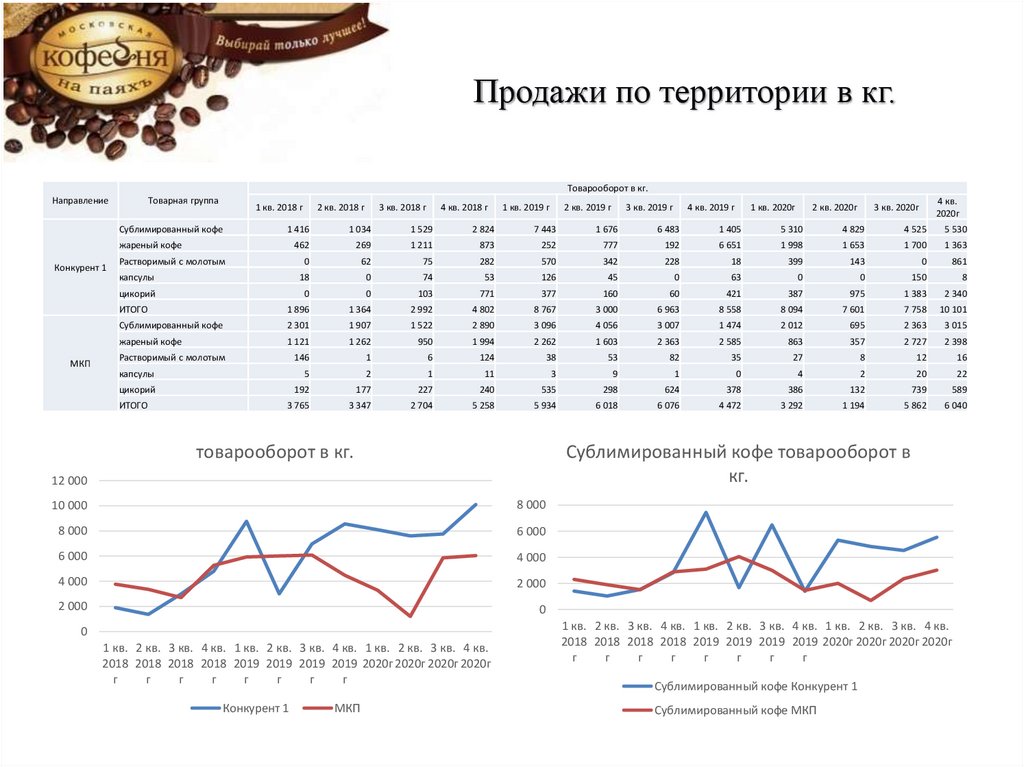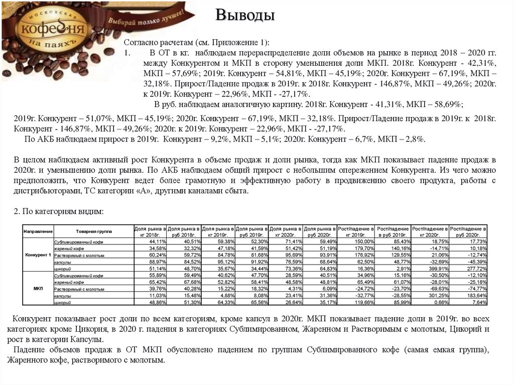 В 2019г. прирост по всем категориям у Конкурента и МКП. В 2020г. Общее падение в категории Растворимый с молотым и