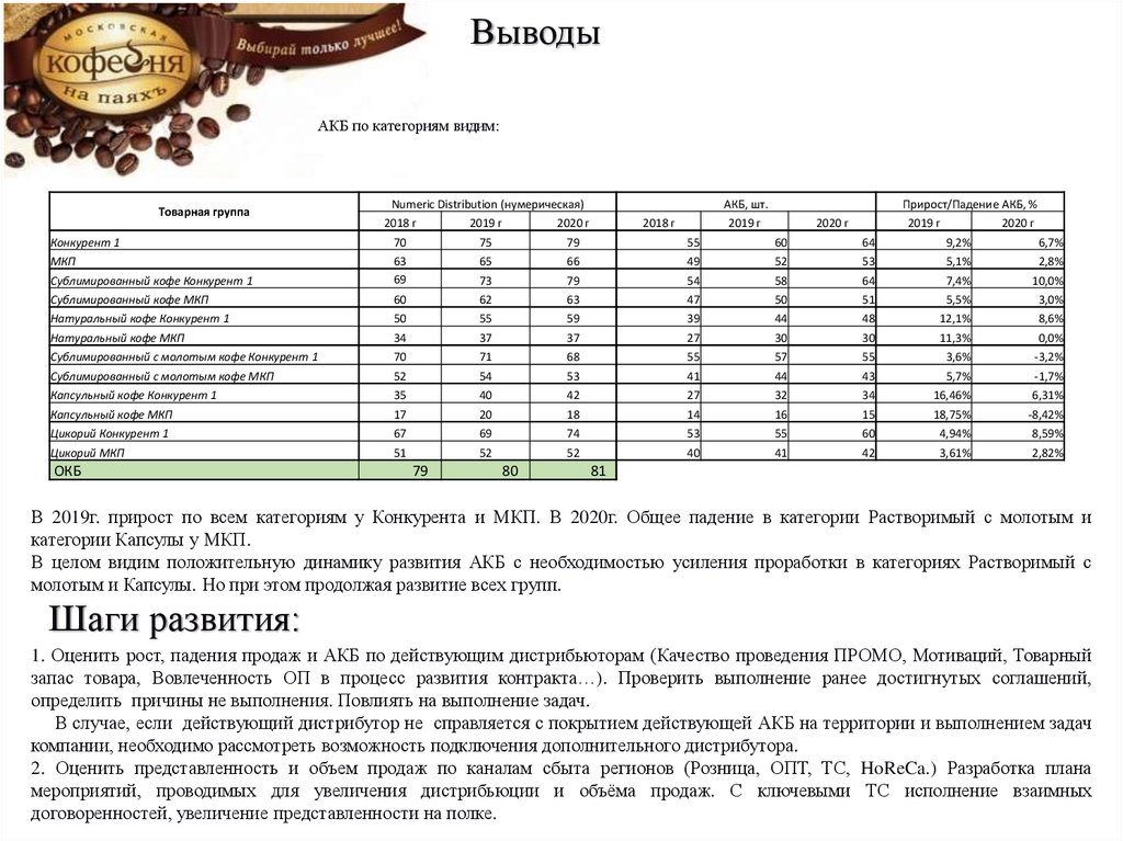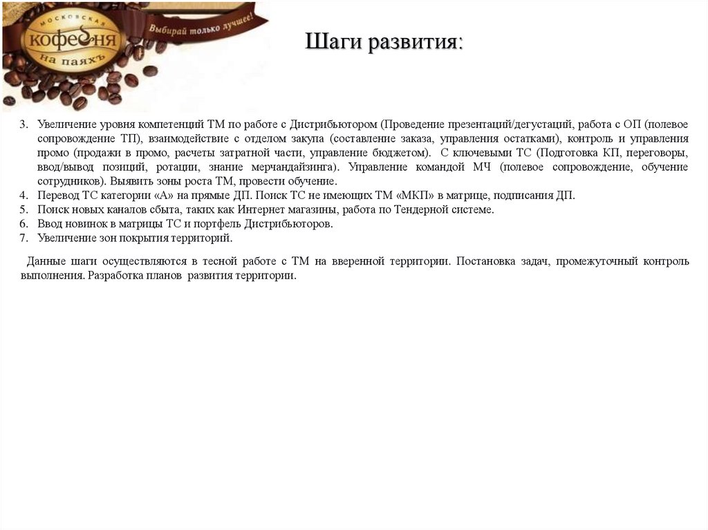 Шаги развития:3. Увеличение уровня компетенций ТМ по работе с Дистрибьютором (Проведение презентаций/дегустаций, работа с ОП (полевое