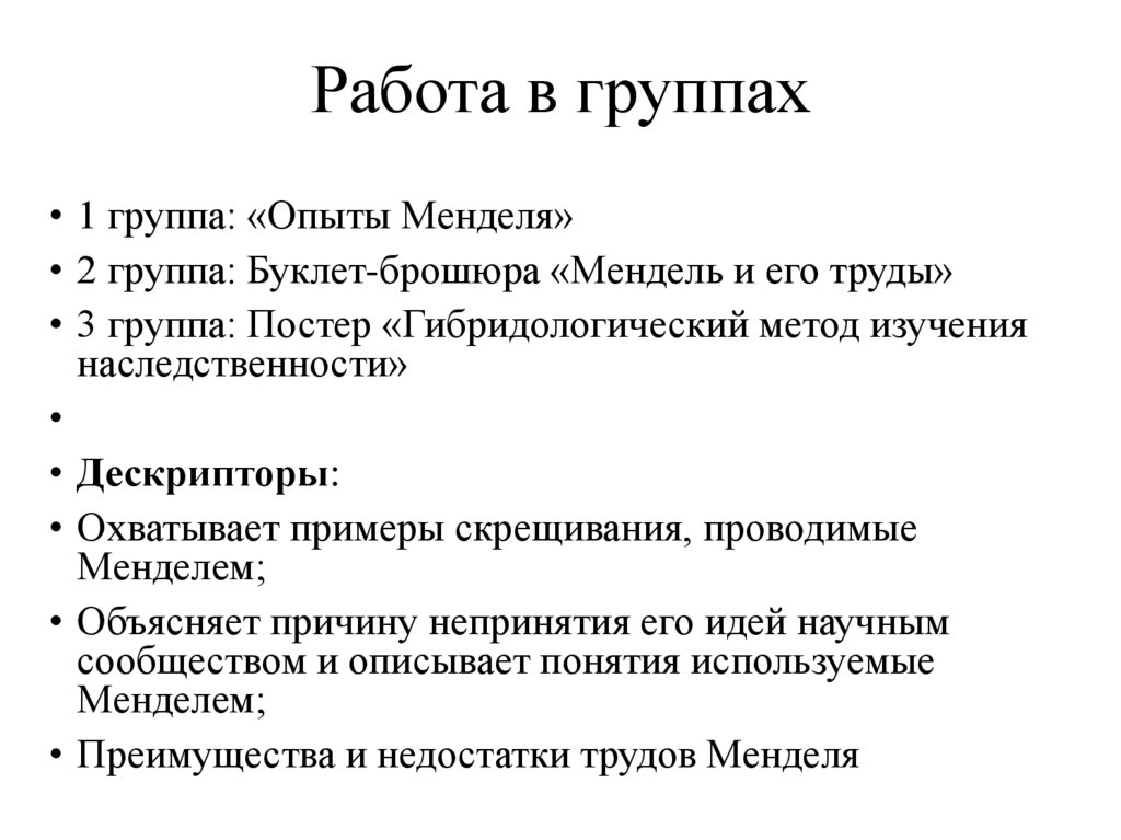 Работа в группах• 1 группа: «Опыты Менделя»