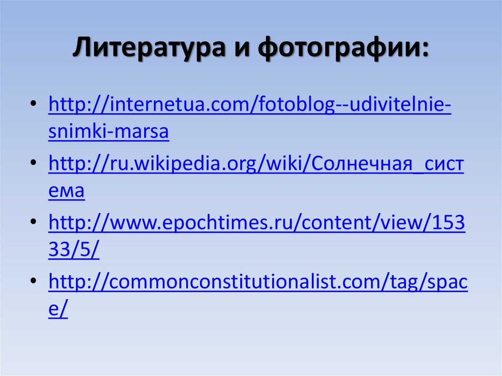 Литература и фотографии:• http://internetua.com/fotoblog--udivitelniesnimki-marsa