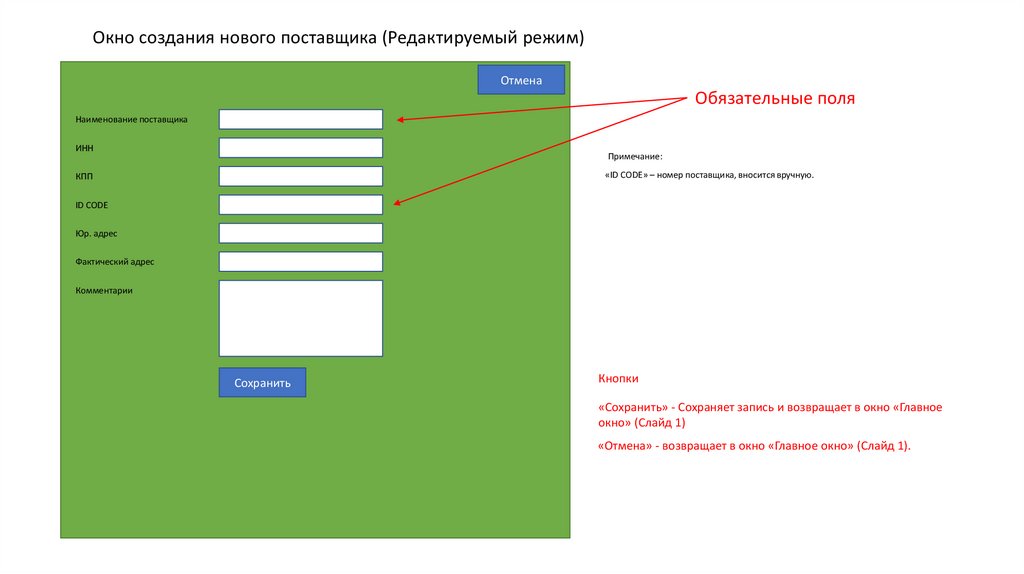 Окно создания нового поставщика (Редактируемый режим)Отмена