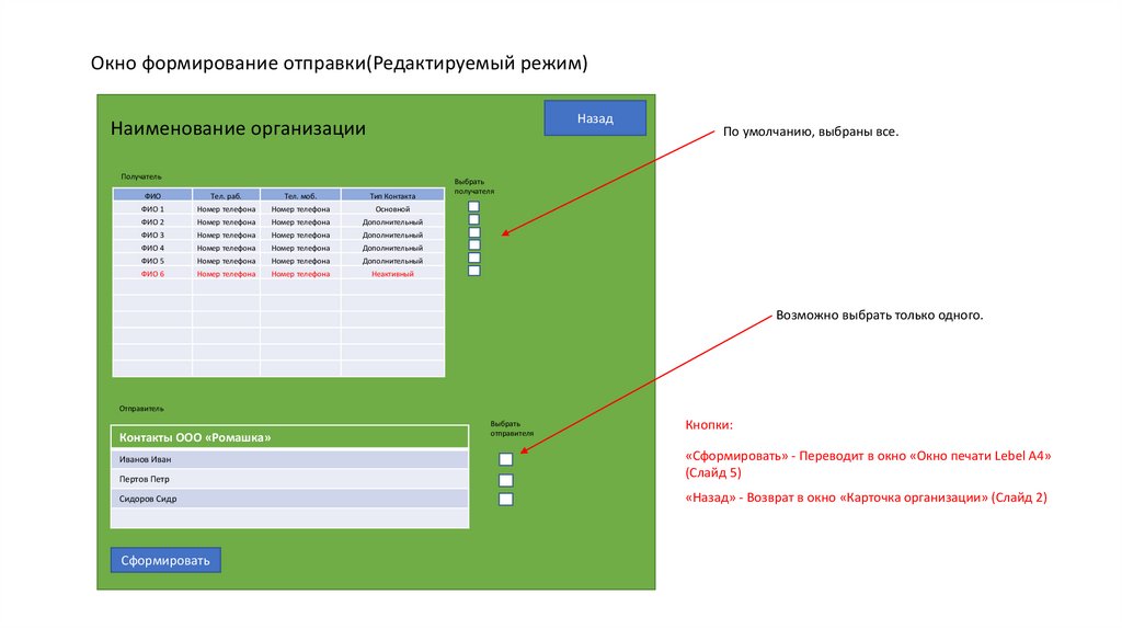 Окно формирование отправки(Редактируемый режим)Назад