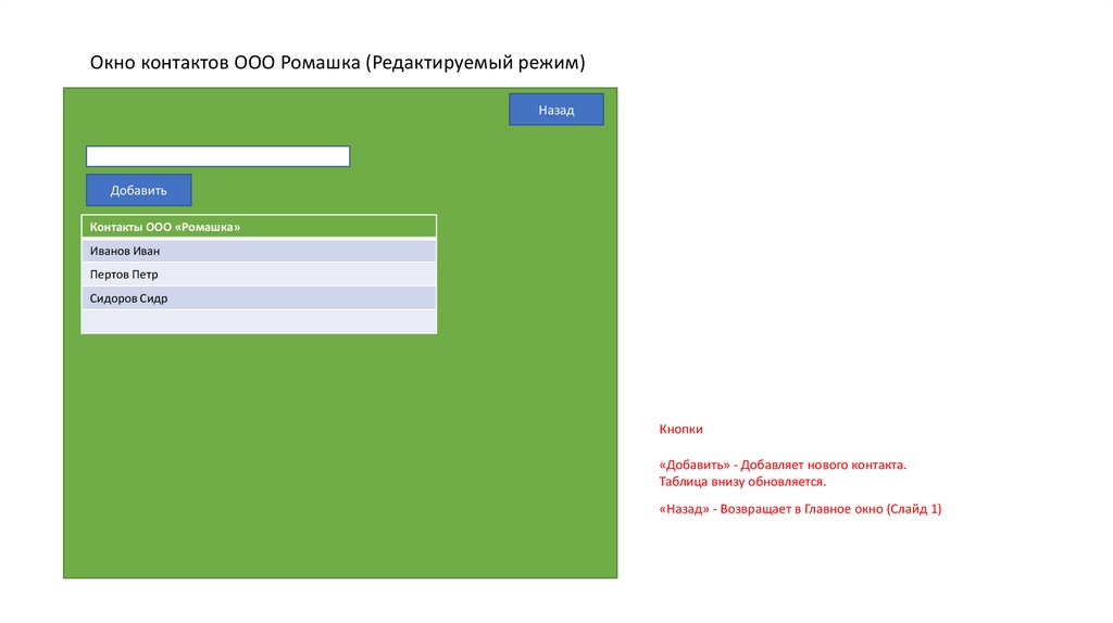 Окно контактов ООО Ромашка (Редактируемый режим)Назад
