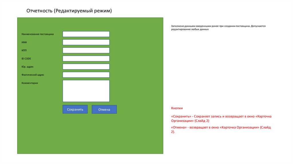 Отчетность (Редактируемый режим)Заполнено данными введенными ранее при создании поставщика. Допускается