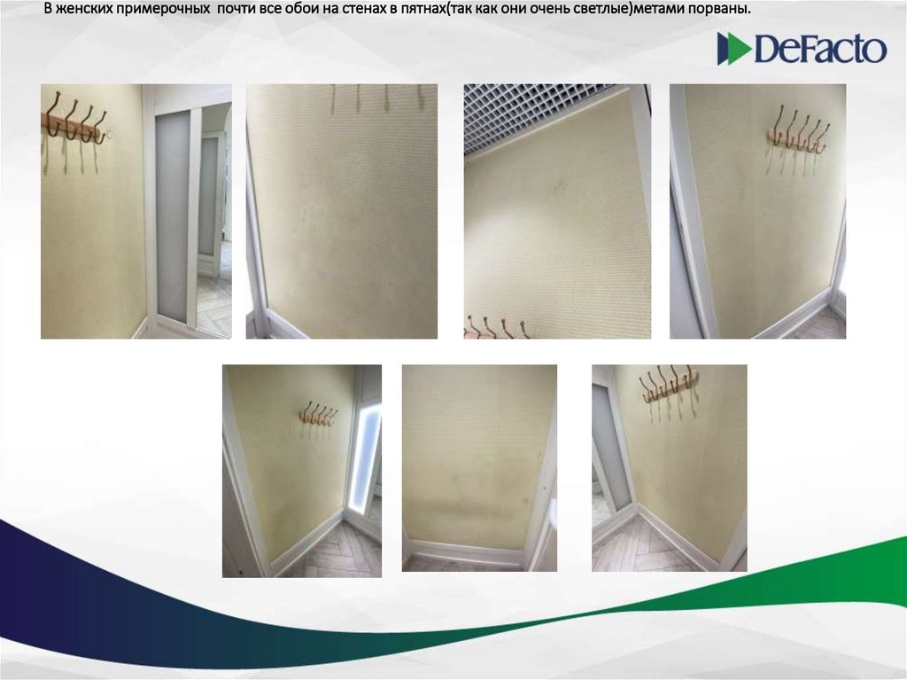 В женских примерочных почти все обои на стенах в пятнах(так как они очень светлые)метами порваны.