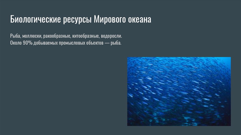 Биологические ресурсы Мирового океанаРыба, моллюски, ракообразные, китообразные, водоросли.