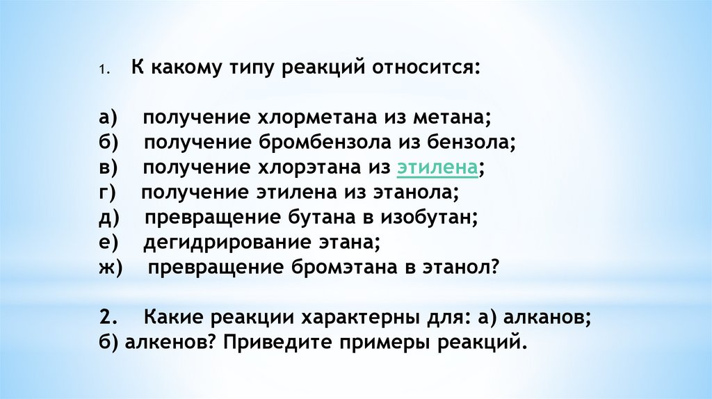 2. Какие реакции характерны для: а) алканов;