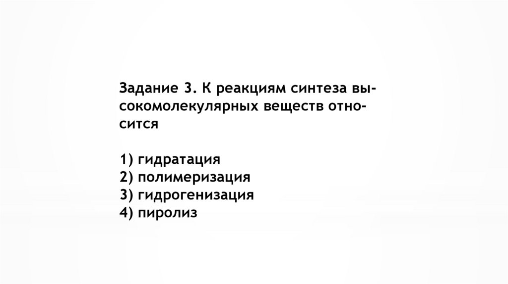 Задание 3. К реакциям синтеза высокомолекулярных веществ относится1) гидратация