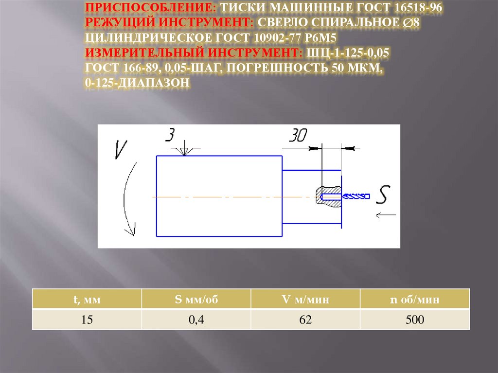 ПРИСПОСОБЛЕНИЕ: ТИСКИ МАШИННЫЕ ГОСТ 16518-96РЕЖУЩИЙ ИНСТРУМЕНТ: СВЕРЛО СПИРАЛЬНОЕ Ø8