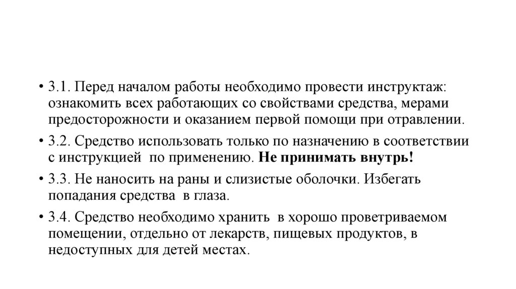 • 3.1. Перед началом работы необходимо провести инструктаж:ознакомить всех работающих со свойствами средства, мерами