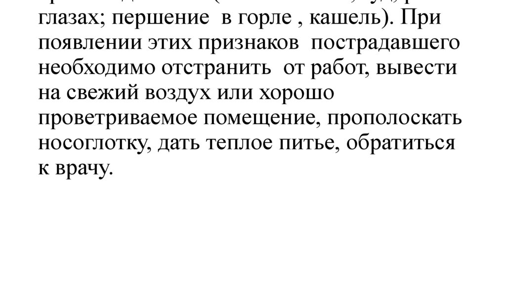 глазах; першение в горле , кашель). Припоявлении этих признаков пострадавшего
