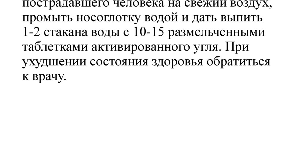 пострадавшего человека на свежий воздух,промыть носоглотку водой и дать выпить