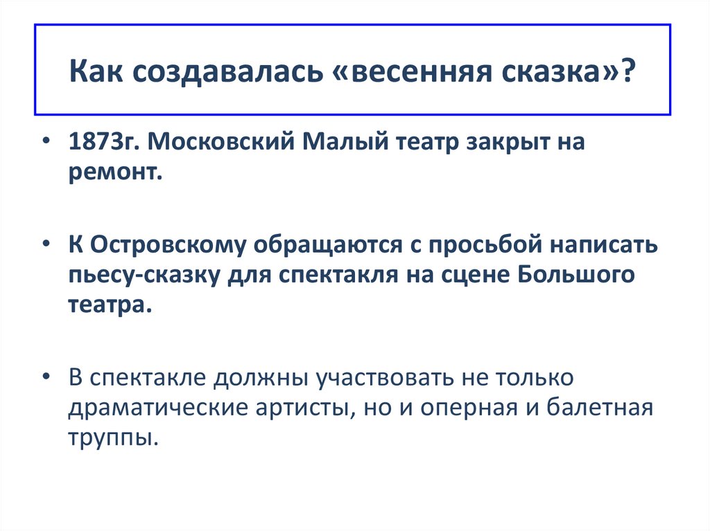 Как создавалась «весенняя сказка»?• 1873г. Московский Малый театр закрыт на