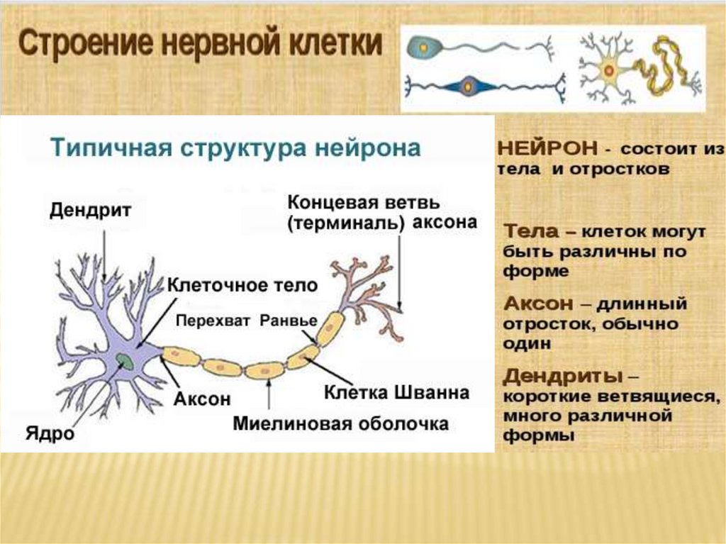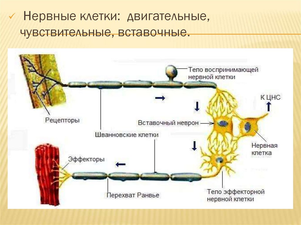 Нервные клетки: двигательные,чувствительные, вставочные.