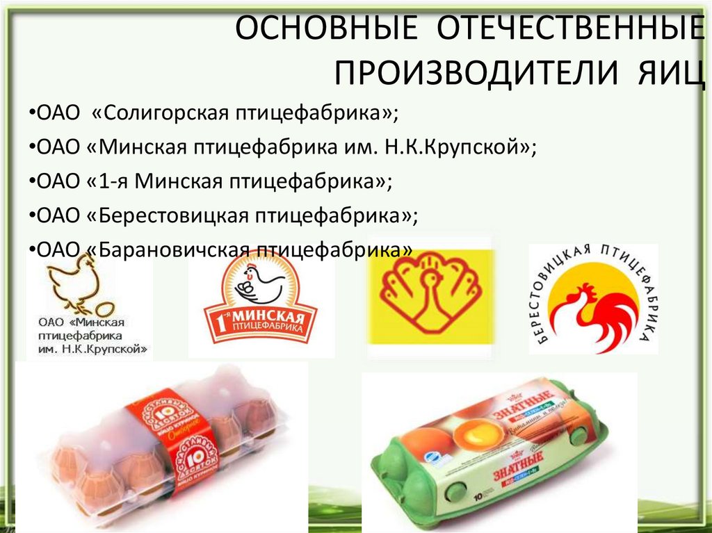 ОСНОВНЫЕ ОТЕЧЕСТВЕННЫЕПРОИЗВОДИТЕЛИ ЯИЦ