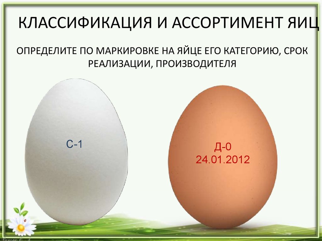 КЛАССИФИКАЦИЯ И АССОРТИМЕНТ ЯИЦОПРЕДЕЛИТЕ ПО МАРКИРОВКЕ НА ЯЙЦЕ ЕГО КАТЕГОРИЮ, СРОК