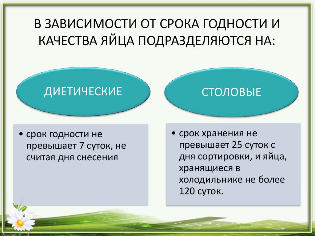 В ЗАВИСИМОСТИ ОТ СРОКА ГОДНОСТИ ИКАЧЕСТВА ЯЙЦА ПОДРАЗДЕЛЯЮТСЯ НА: